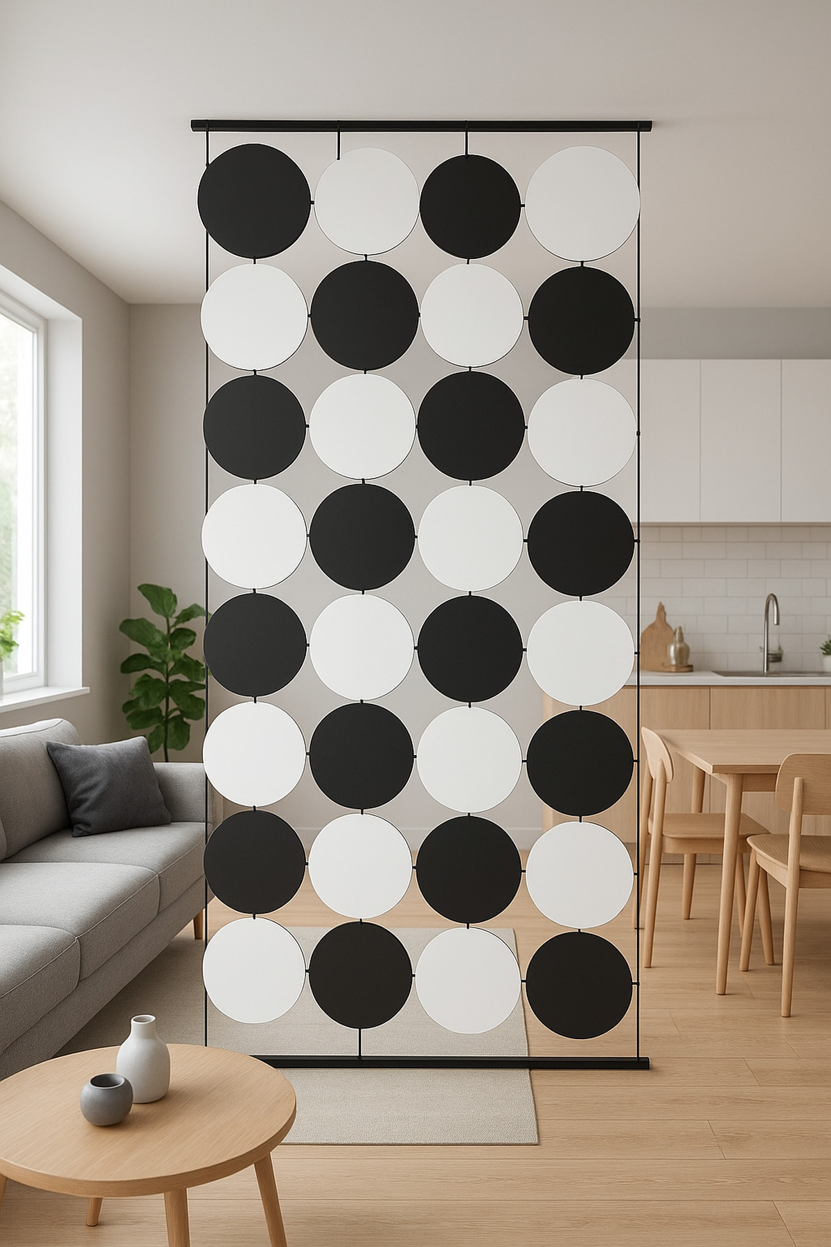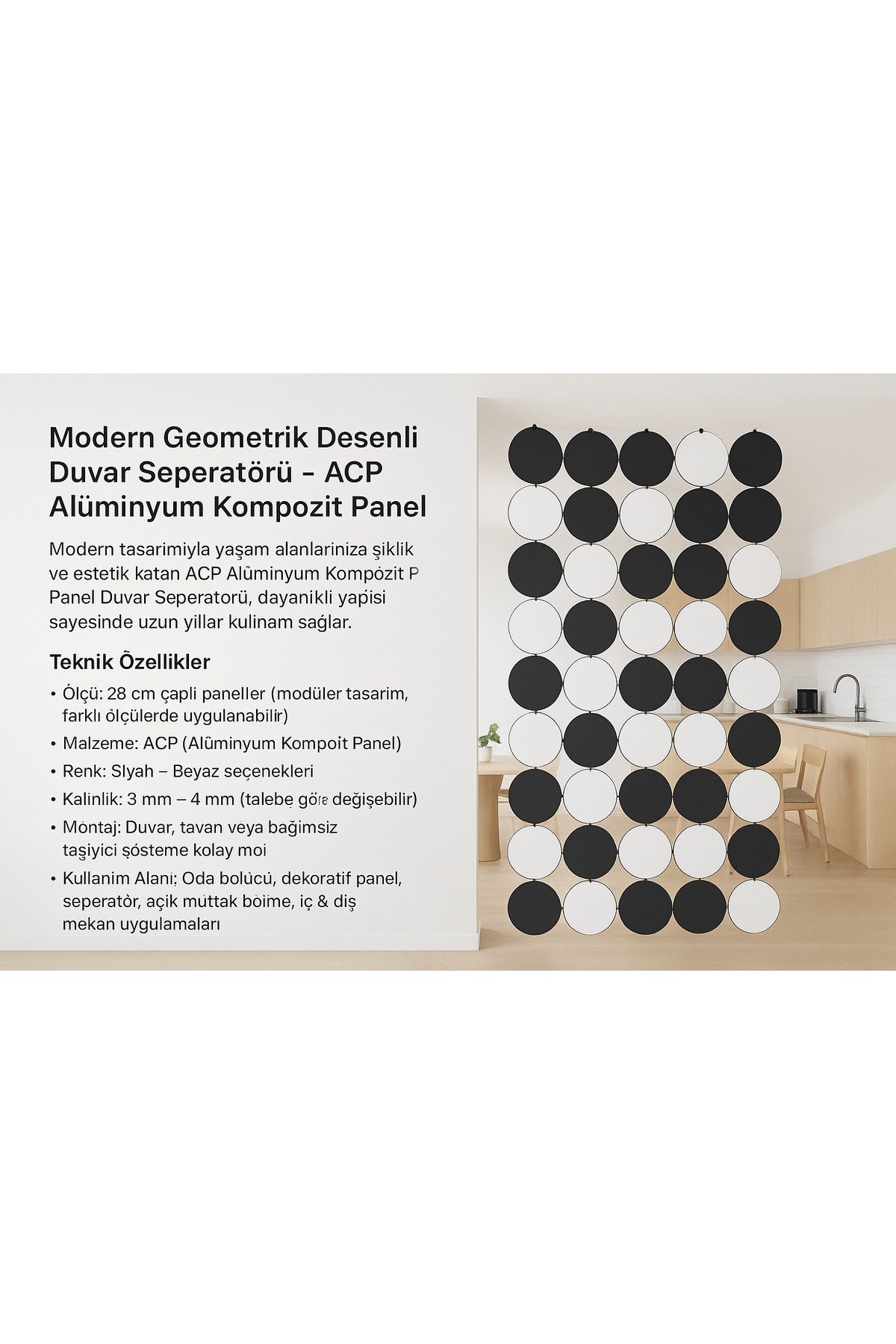- Modern desenleriyle dikkat çeken bu duvar seperatörü, mekanınıza şık bir dokunuş katıyor.; - CNC kesim teknolojisi sayesinde hassas ve düzgün hatlara sahip olan bu ürün, uzun ömürlü kullanım sunuyor.; - 28x28 cm boyutlarındaki panel sayısı ile geniş alanları kolayca bölebilirsiniz.; - Alüminyum Kompozit Panel malzemesi sayesinde dayanıklılığı artırılmış ve kaliteli bir görünüm kazandırılmıştır.; - Çok renkli web rengi seçeneği ile dekorasyonunuza uyum sağlayacak çeşitli tonlarda mevcuttur.; - Makermach İmalat tasarım üretim tesislerinde üretilmiş olup, yerel ekonomiyi destekleyerek sürdürülebilirlik ilkesine katkıda bulunur.; - Siyah-beyaz kombinasyonuyla hem klasik hem de modern dekorasyon stilleriyle uyumlu bir estetik sergiliyor.; NOT: Sepete 1 adet eklediğinizde 1 adet 28cm çapında daire almış olursunuz.; Kaplayacağınız alan için satıcıya soru sorarak kaplayacağınız alanı birlikte tespit edebiliriz.